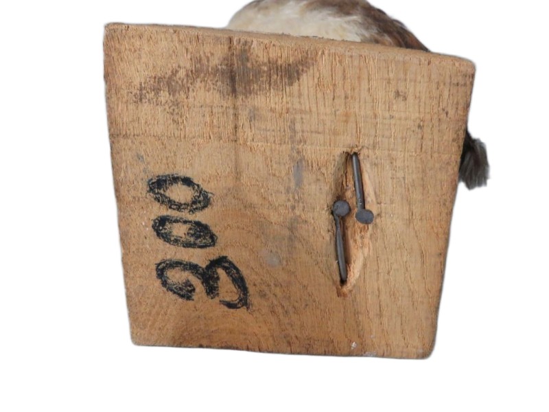 Dit vintage taxidermiestuk toont de vogel in een natuurlijke, rechtopstaande houding op een houten sokkel met baststructuur. Het specimen vertoont een zacht verweerde patina, typerend voor opgezette dieren uit de midden 20e eeuw.